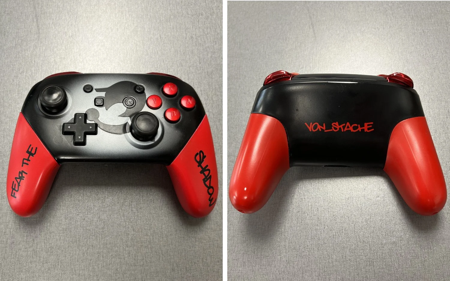 As both a recognition of his accomplishments, and a cool way to prepare Timothy for the next Smash Bros. season, John bought his son a custom Nintendo Switch Pro controller, with a Mr. Game & Watch silhouette on the front, as well as “VON_STACHE” on the back.